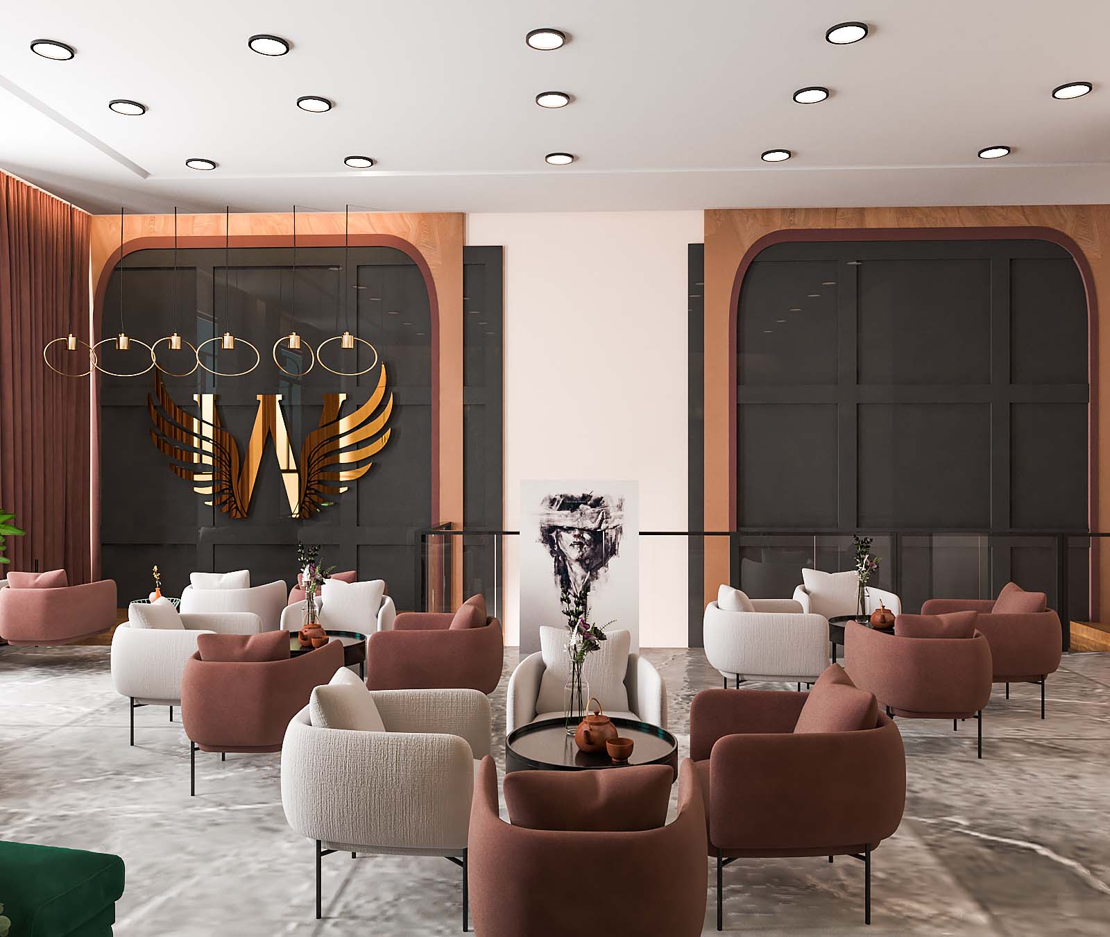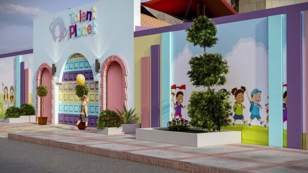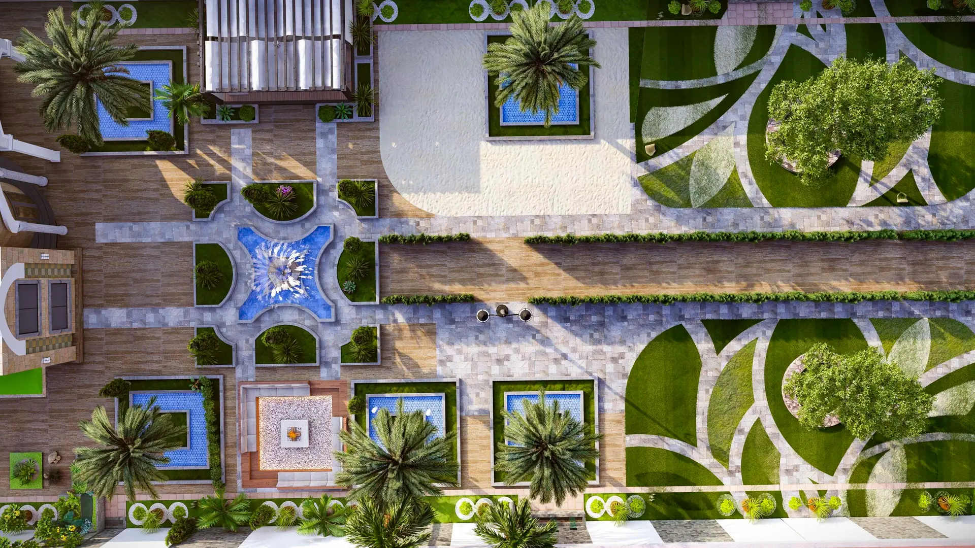 تصميم ثلاثي الأبعاد لحدائق خارجية مع زوايا للتصوير والجلسات والمرافق الخاصة بالتصميم حسب الطلب